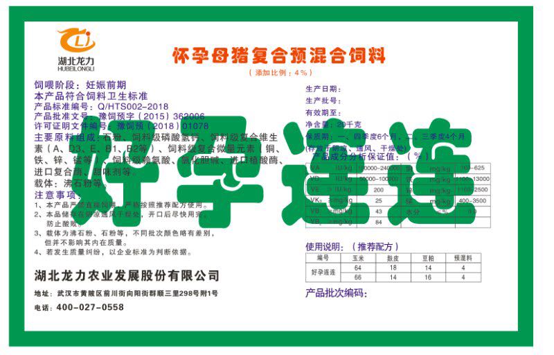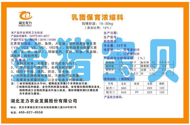 湖北龍力農業發(fā)展股份有限公司坐落于武漢市黃陂區前川街向陽街群順三里298號附1號。公司成立于2014年6月,公司自成立以來把“創(chuàng)全球最大養豬綜合服務”為企業愿景。致力于打造教保料品牌”作為公司發(fā)展的明確目標。公司一直致力于豬營養的研究和開發(fā),積極與國內外高校和科研機構合作,推廣養豬技術、動物營養新概念,向世界農牧企業學習與合作。公司采用國內先進的生產工藝,選擇高精度電子配料秤,高均勻度、無殘留混合機等先進設備....